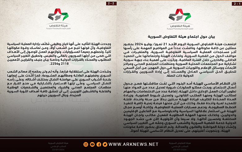 أصدرت "هيئة التفاوض السورية" بيانا حول التعديلات على نظامها الأساسي، بما في ذلك مدة رئاستها، خلال اجتماع عقدته يوم الأحد 21 تموز 2024.