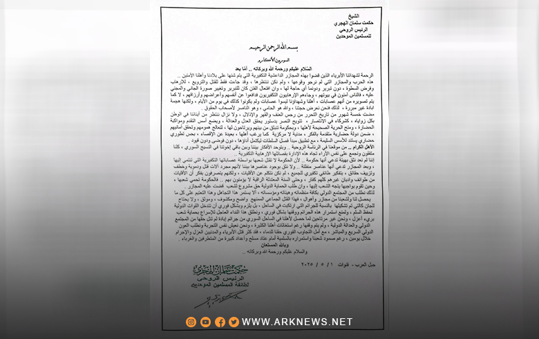 الأهل الكرام .. من موقعنا في الرئاسة الروحية وبتوحد أفكارنا بيننا وبين باقي إخوتنا في النسيج السوري، كلنا متفقون ونجمع على نفس الآراء تجاه هذه الإدارة بفصائلها الإرهابية التكفيرية ..