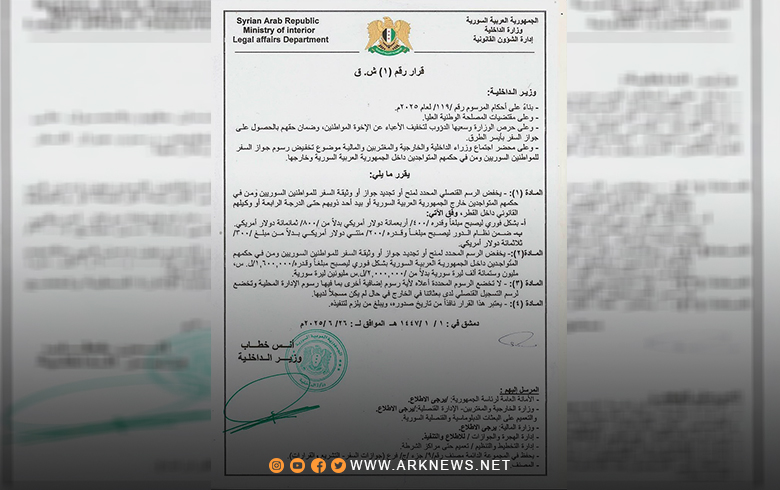 نص قرار وزير الداخلية السوري، أنس خطاب، على تخفيض الرسم القنصلي للمقيمين في الخارج إلى 400 دولار أميركي لإصدار الجواز الفوري بدلاً من 800 دولار سابقاً، و200 دولار عند التقديم بنظام الدور، بدلاً من 300 دولار.