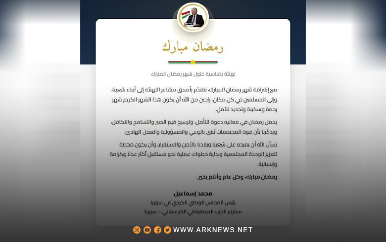 وجه محمد إسماعيل رئيس المجلس الوطني الكوردي في سوريا، وسكرتير الحزب الديمقراطي الكوردستاني-سوريا، بمناسبة حلول شهر رمضان المبارك، رسالة تهنئة إلى المسلمين في كل مكان، راجيا من الله أن يكون هذا الشهر الكريم شهر رحمة وسكينة وتجديد للأمل